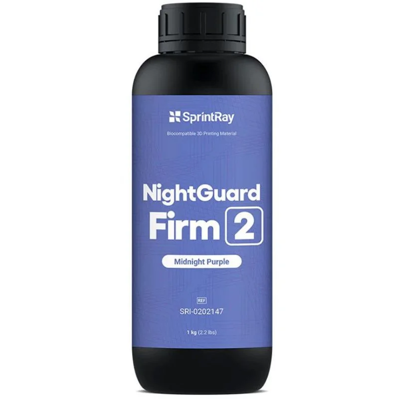 Conçue pour l’impression 3D de gouttières occlusales rigides de haute qualité, la résine NightGuard Firm II Midnight Purple de SprintRay combine robustesse, durabilité et esthétique. Dotée de propriétés mécaniques avancées, elle résiste au grincement et au serrement des dents tout en offrant une finition translucide et polissable.